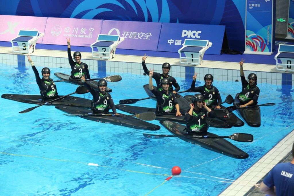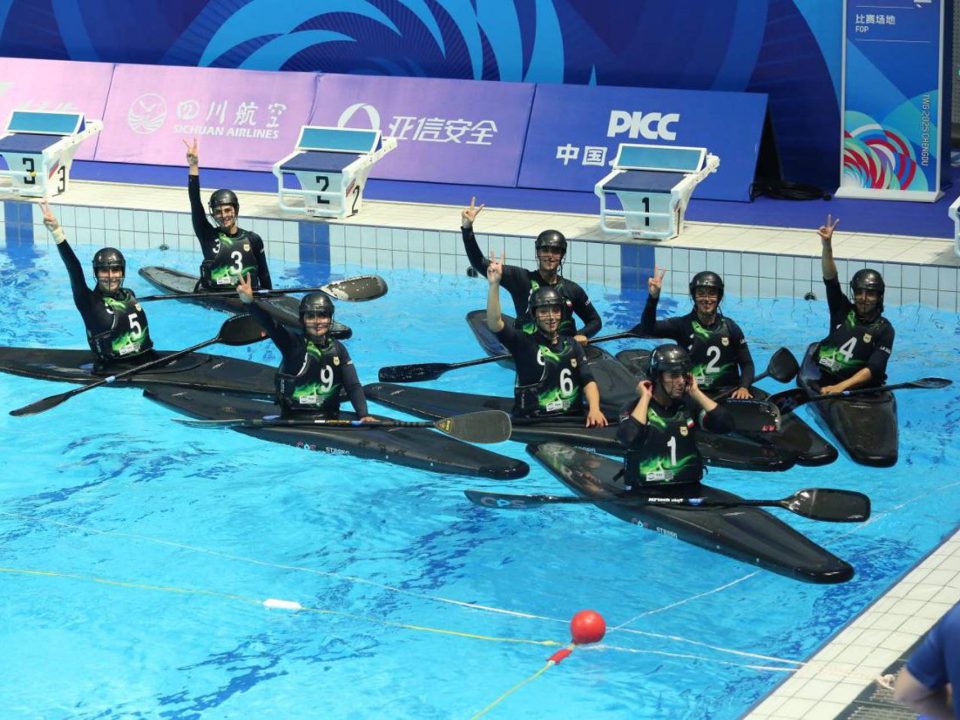 تیم ملی کانوپولو بانوان ایران (اصفهان خروشان) در پایان بازیهای جهانی در چنگدو چین پس از غلبه بر تیم میزبان …